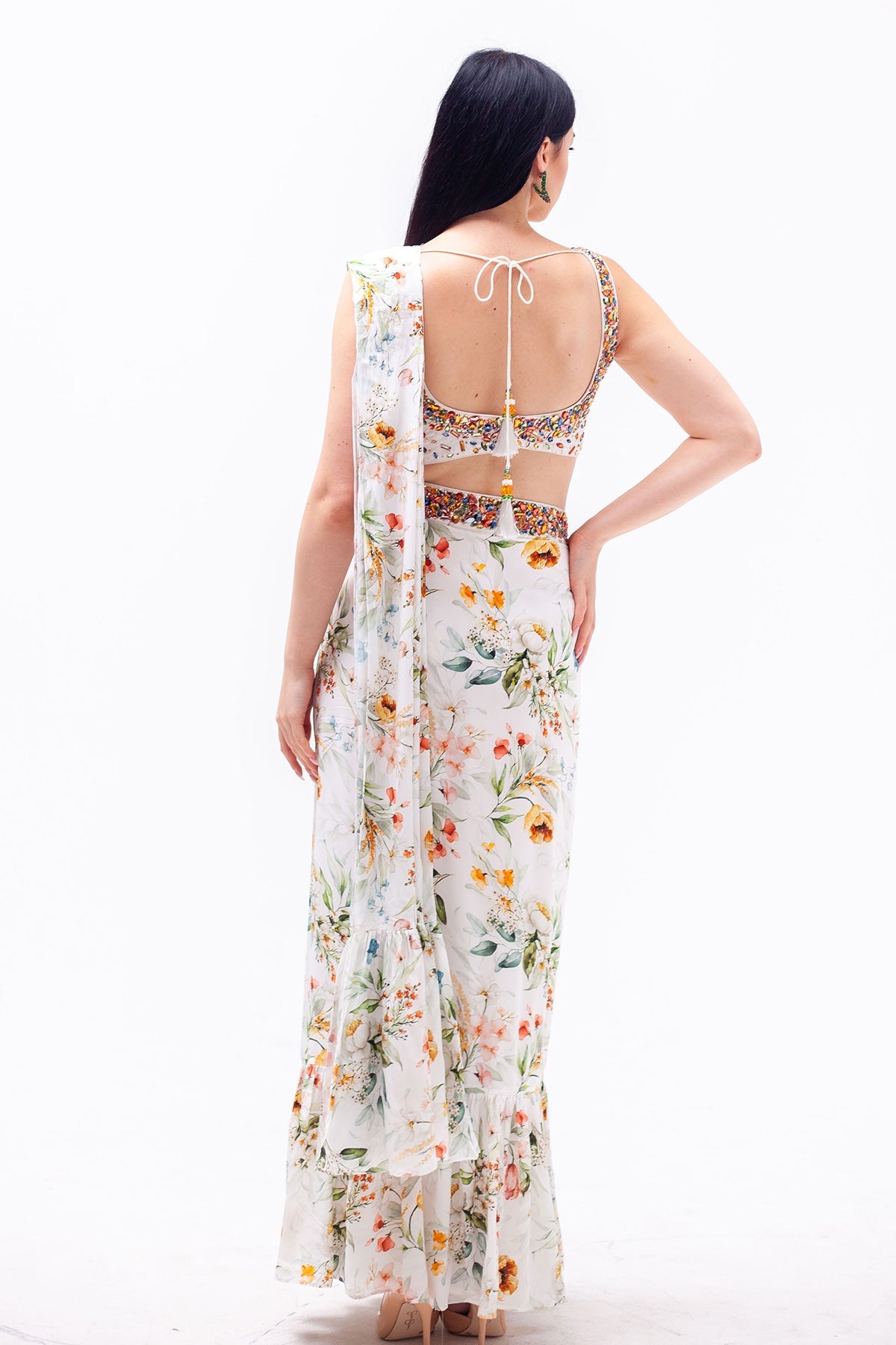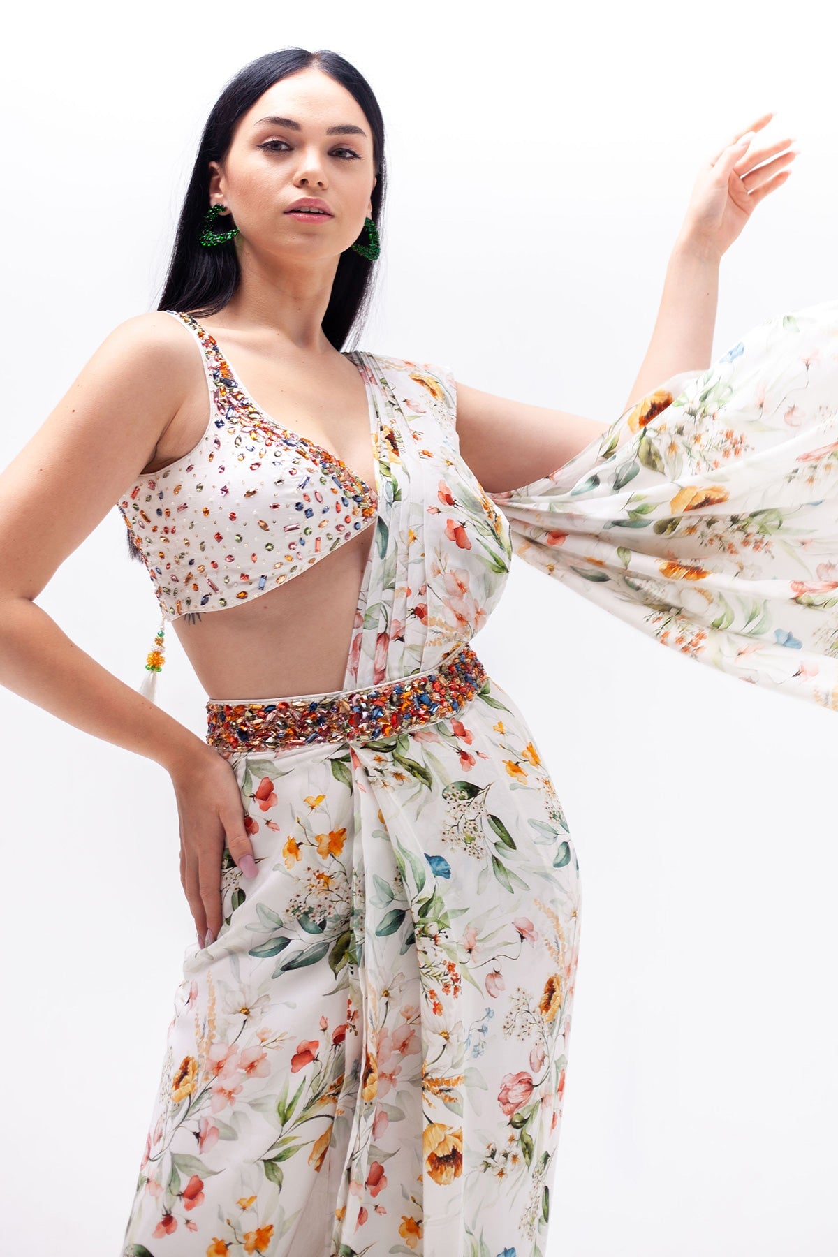 In ivory beaded plunge neck crop top with multi colour crystal worn over a wrap around style ready made sari which creates a slit on one side, with ruffled tier on the hem.