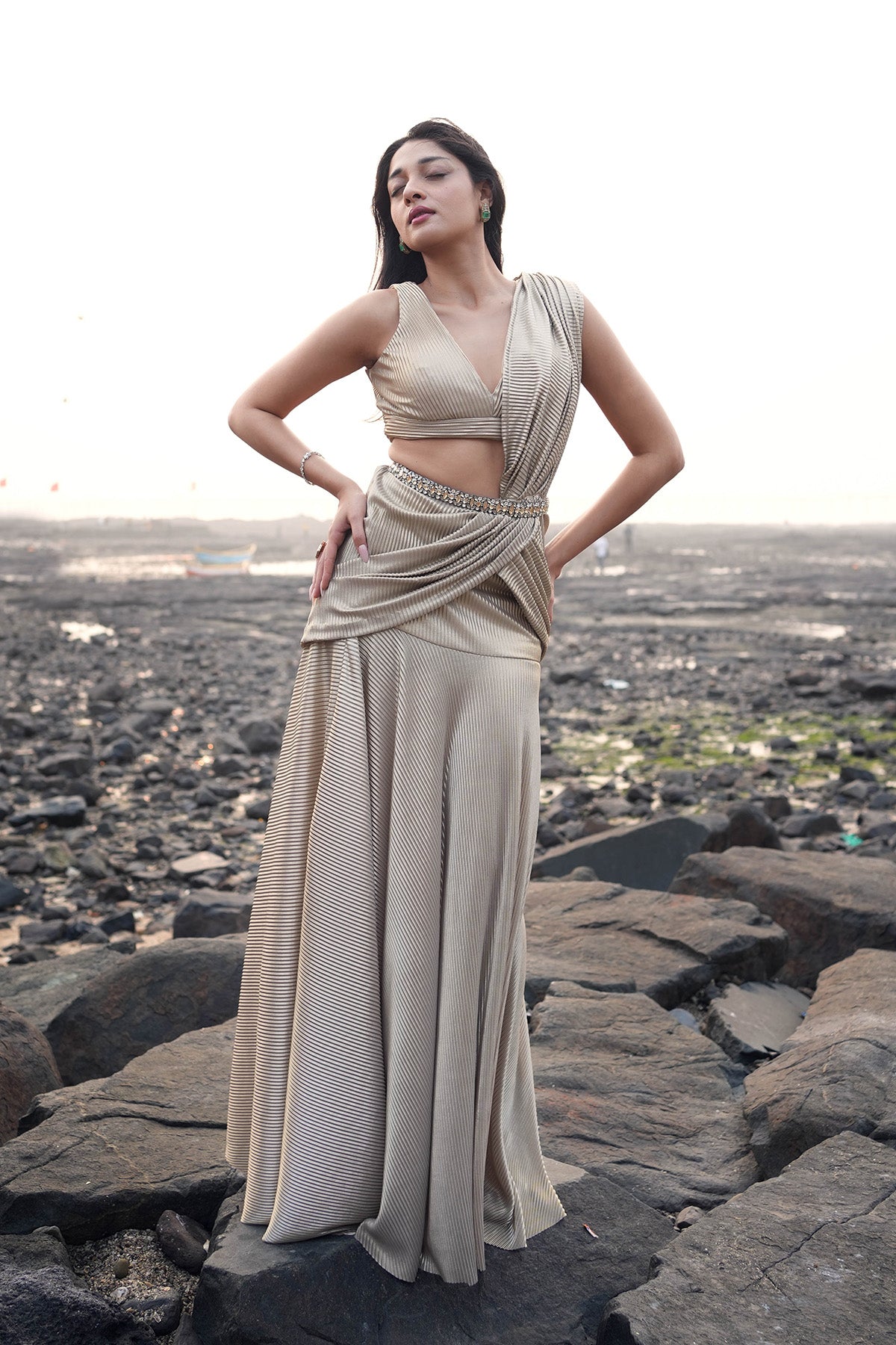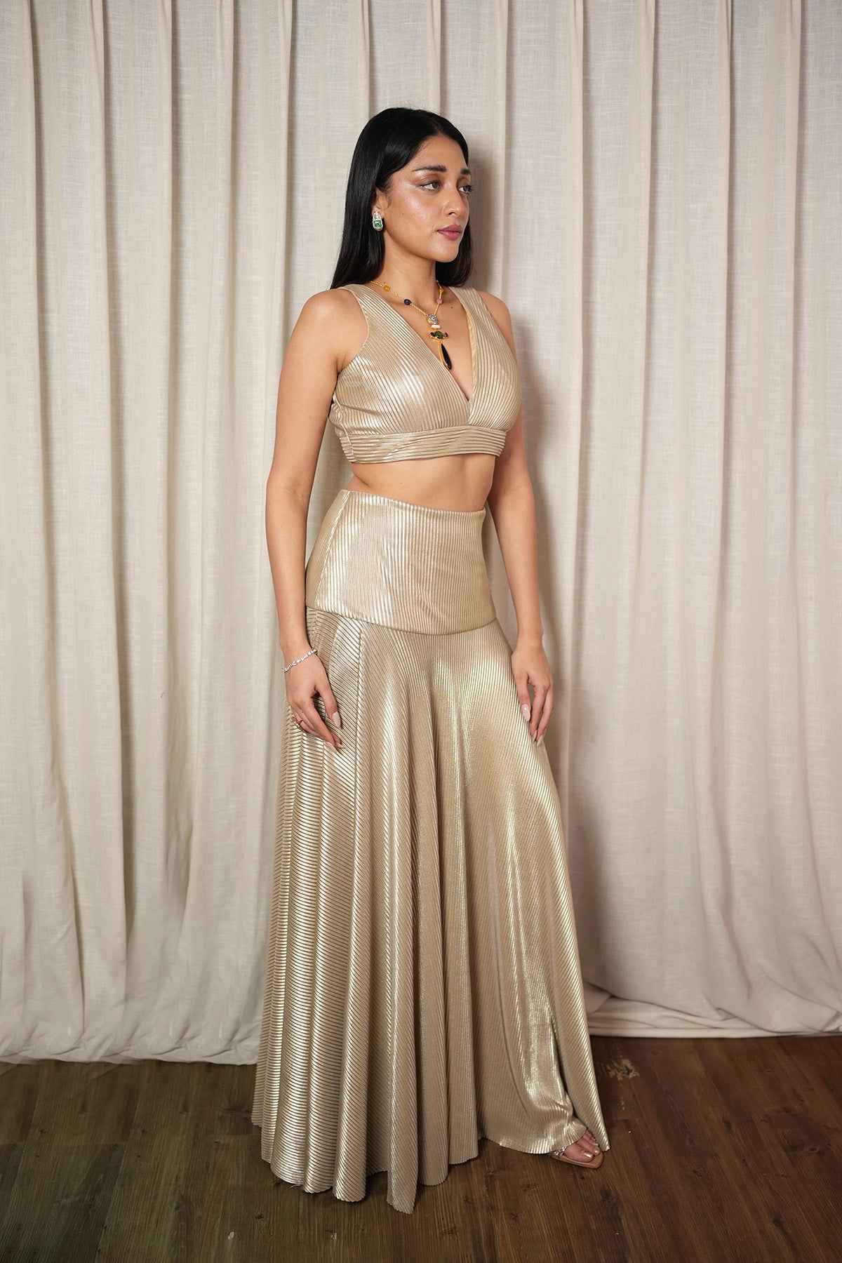 A Three-Piece Metallic Gold Sari Set Featuring A Plunge V-Neck Crop Top, A Flowy Skirt With A Structured Yoke, And A Detachable Pleated Drape That Converts The Look Into A Modern Sari.